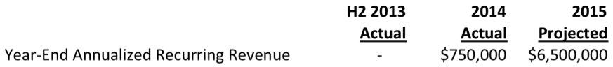 This means that only 13% of the forward revenue will come from existing customers, a relatively low number. In a more mature SaaS business, we would look for a number closer to 70%. Having an existing customer contribution of 13% is not necessarily bad; it simply means that you have to grow very fast in order to hit your forward number. In order to achieve $6.5 million of revenue in 2015, just under $5.7 million of new sales need to be made. This is no small task for a business of this size; the company would need to find new revenue in an amount over 7x its existing run rate revenue. Is this achievable? Unlikely, but we would need to look at the pipeline to be sure.